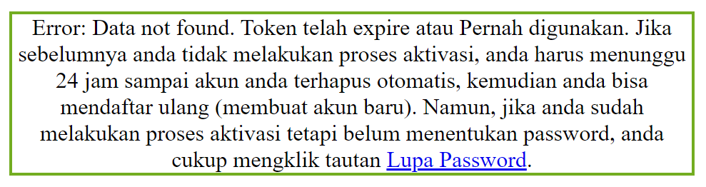 Jawaban. Jika anda menerima kode seperti gambar di bawah ini, itu menandakan token tersebut pernah digunakan, itu artinya akun anda sudah aktif, tidak perlu lagi melakukan aktifasi, karena halaman tautan aktifasi yang diterima pernah dikunjungi satu kali. Namun bisa dipastikan anda belum sempat membuat password baru karena password baru dibuat ketika berhasil melakukan aktifasi. Jadi pada situasi ini, anda berhasil aktifasi namun tidak berhasil membuat password.